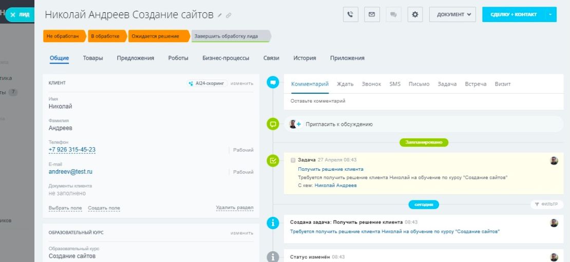 - работа с заявкой по настроенным стадиям лидов и сделок;